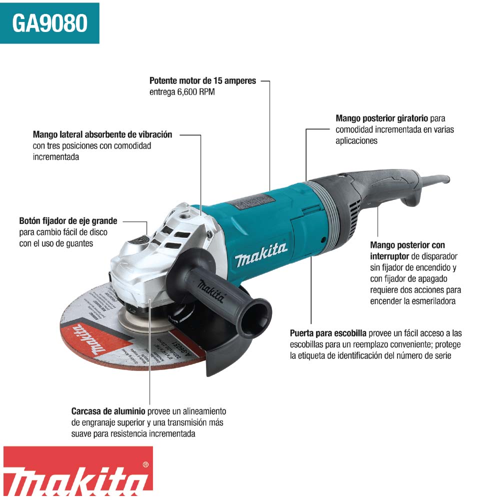 ESPECIFICACIONES Diámetro del Disco : 9″ Amperaje (amperios) : 15 Velocidad Sin Carga : 6,600 RPM Tipo de Eje : 5/8″ – 11 UNC Interruptor de Fijador de Encendido : Sí Longitud Total : 20-1/8″