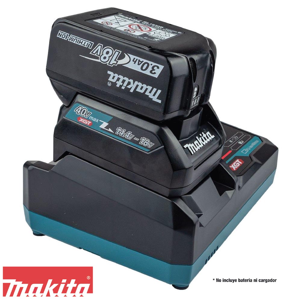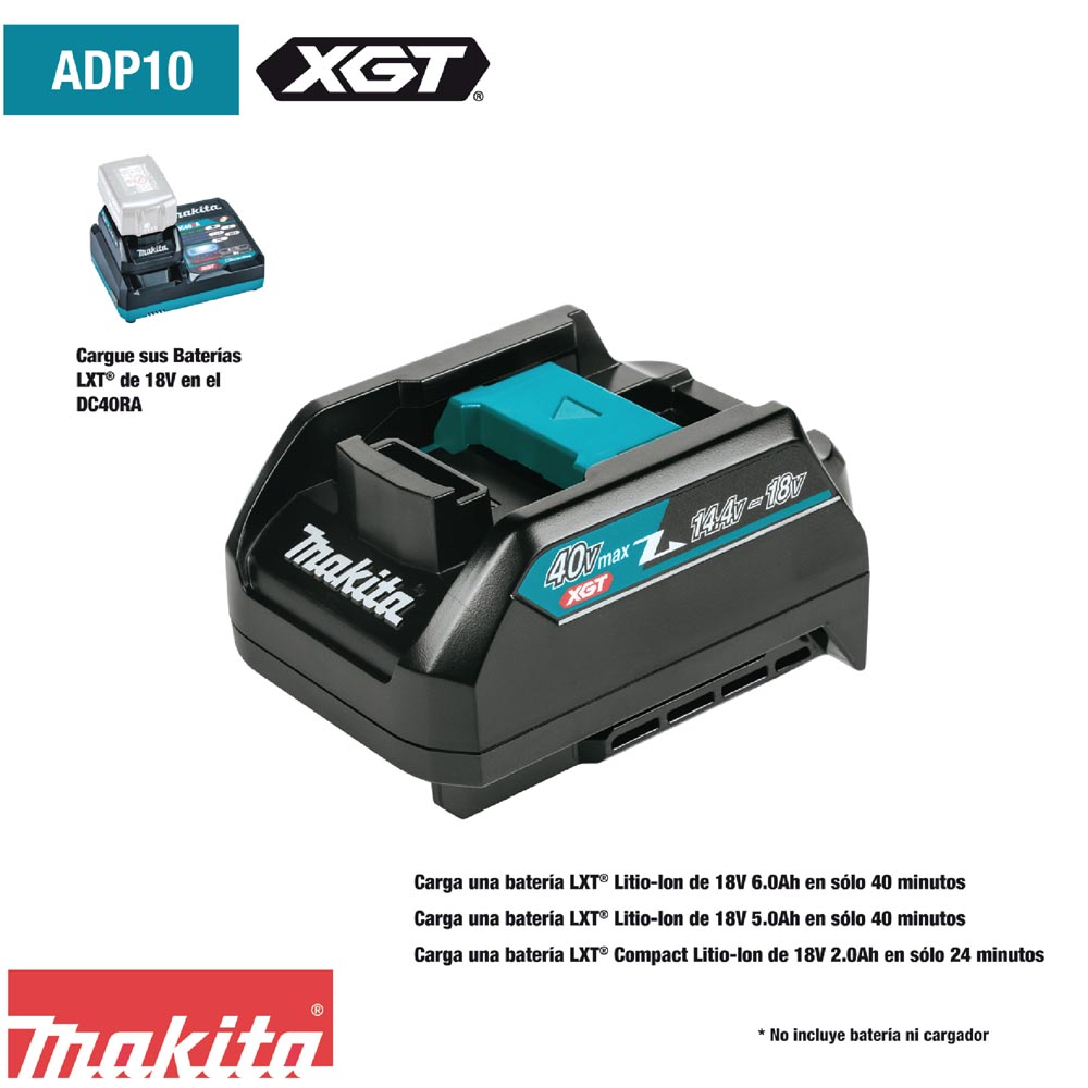 CARACTERISTICAS – Adapta cargadores XGT® de 40V máx. para cargar baterías LXT® de 18V – Carga una batería LXT® Litio-Ion de 18V 6.0Ah en sólo 40 minutos – Carga una batería LXT® Litio-Ion de 18V 5.0Ah en sólo 40 minutos – Carga una batería LXT® Compact Litio-Ion de 18V 2.0Ah en sólo 24 minutos – El Cargador Rápido XGT® con diseño de ventilador dual circula el aire a través de la batería y circuitos para enfriarlos rápidamente para carga más rápida – El monitor digital del Cargador Rápido XGT® indica el nivel de carga de la batería (-80%, +80%, 100%) – La comunicación digital dentro de XGT® monitorea activamente y protege contra sobrecarga, sobre-descarga y sobrecalentamiento
