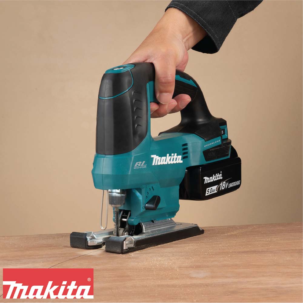 – Sierra caladora 18V brushless Makita, esta herramienta se puede utilizar con una acción de corte orbital o de línea recta (hacia arriba y hacia abajo). Ideal para cortar piezas de madera, acero suave, acero inoxidable, aluminio, y plásticos blandos.