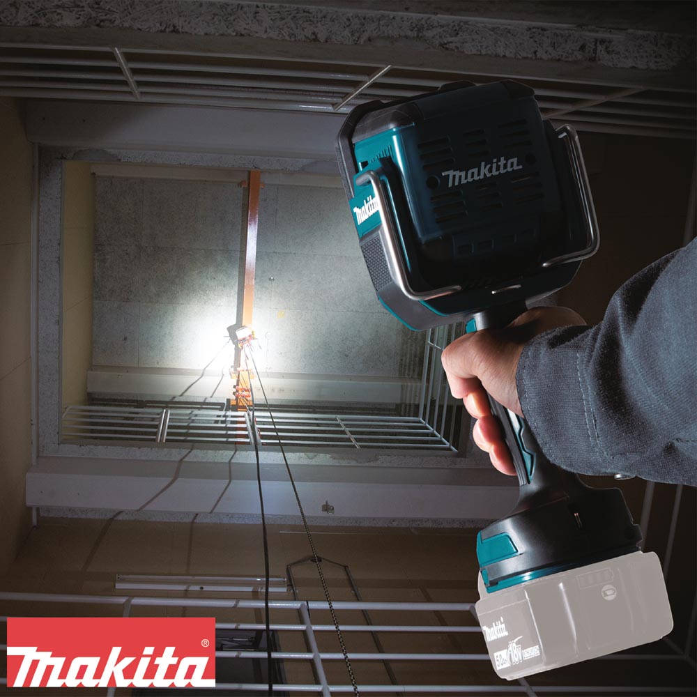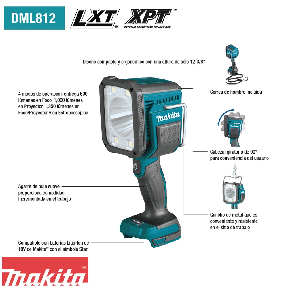ESPECIFICACIONES Voltaje : 18V Batería : LXT® Litio-Ion de 18V Lúmenes (Alta/medio/Baja) : 1,250 / 1,000 / 600 lm Tiempo de ejecución (Alta/medio/Baja) : 4 / 4 / 7 hrs Dimensiones (LxAxA) : 4-11/16″ x 4-1/2″ x 12-3/8″ Peso Neto (con la batería, se vende por separado) : 3.7 lbs. Luz Giratoria : Sí Tipo (Linternas, Reflectores y Faros) : linterna, Reflectores Diseño (LXT) : 18V LXT®