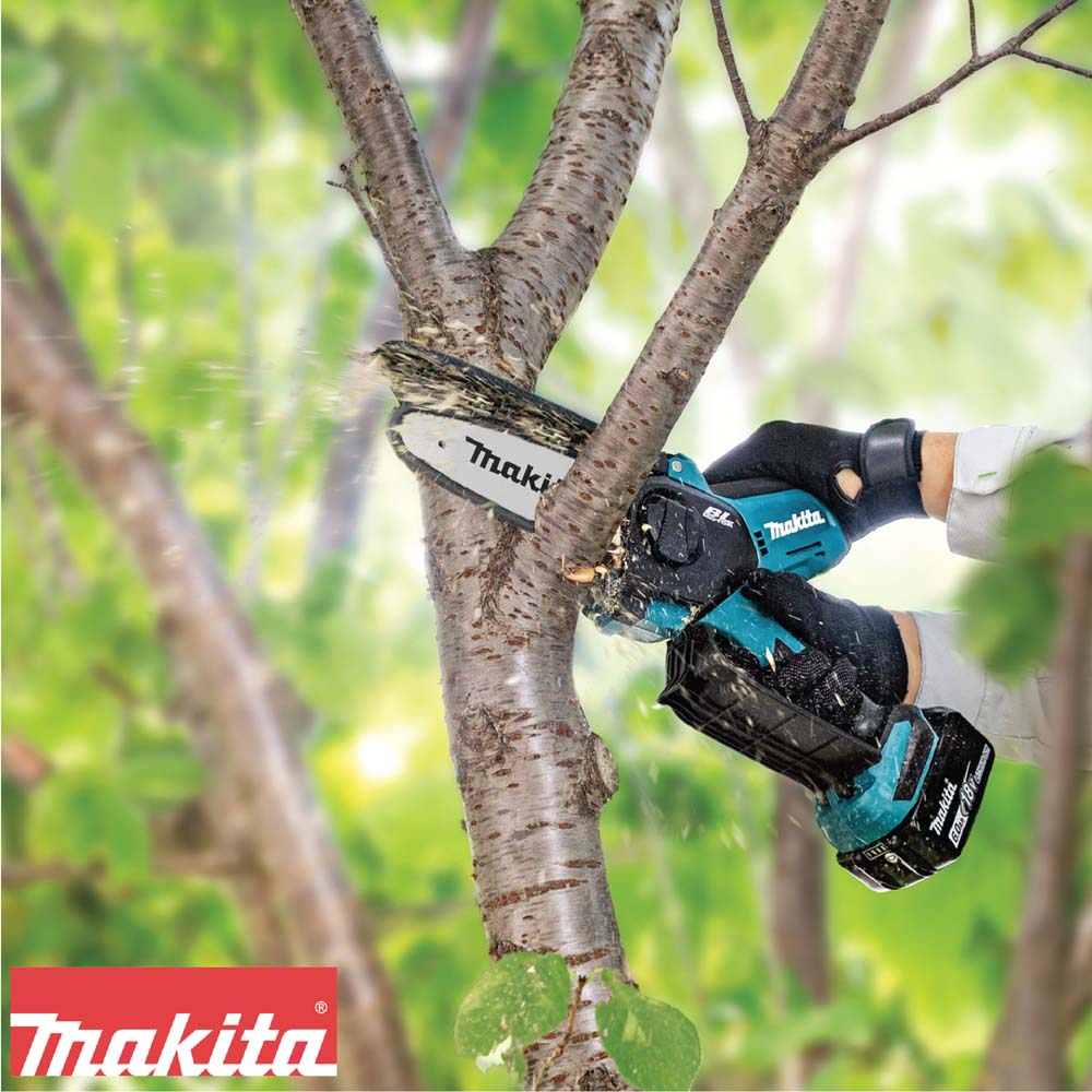 CARACTERISTICAS – Producto fácil de usar, liviano y compacto que permite podar fácilmente árboles de jardín o huerto. – Nuevo cambio y ajuste de tensión de la cadena de sierra sin herramientas • Simplemente afloje y vuelva a apretar la palanca para ajustar automáticamente la tensión de la cadena de sierra • Esta palanca grande y fácil de operar está diseñada para levantarse y girarse fácilmente – La lubricación automática de la cadena minimiza la posibilidad de que la cadena de sierra se detenga debido a que se olvida suministrar aceite para la cadena. – Motor BL compacto y liviano para una mayor eficiencia en operación – Palanca de bloqueo accesible desde ambos lados. – Guardamanos trasero – La protección móvil cubre el lado superior de la barra guía y se abre gradualmente a medida que la cadena de sierra corta más profundamente en la rama. – Cadena de sierra: 80TXL 150mm – La ventana de visualización del aceite de la cadena permite al operador verificar fácilmente el nivel de aceite – Mango de agarre suave para operación antideslizante – Freno eléctrico para máxima productividad – La tecnología de protección extrema (XPT) está diseñada para mejorar la resistencia al polvo y al agua para operar en condiciones difíciles. – El circuito de protección de la batería protege contra sobrecarga, sobredescarga y sobrecalentamiento.