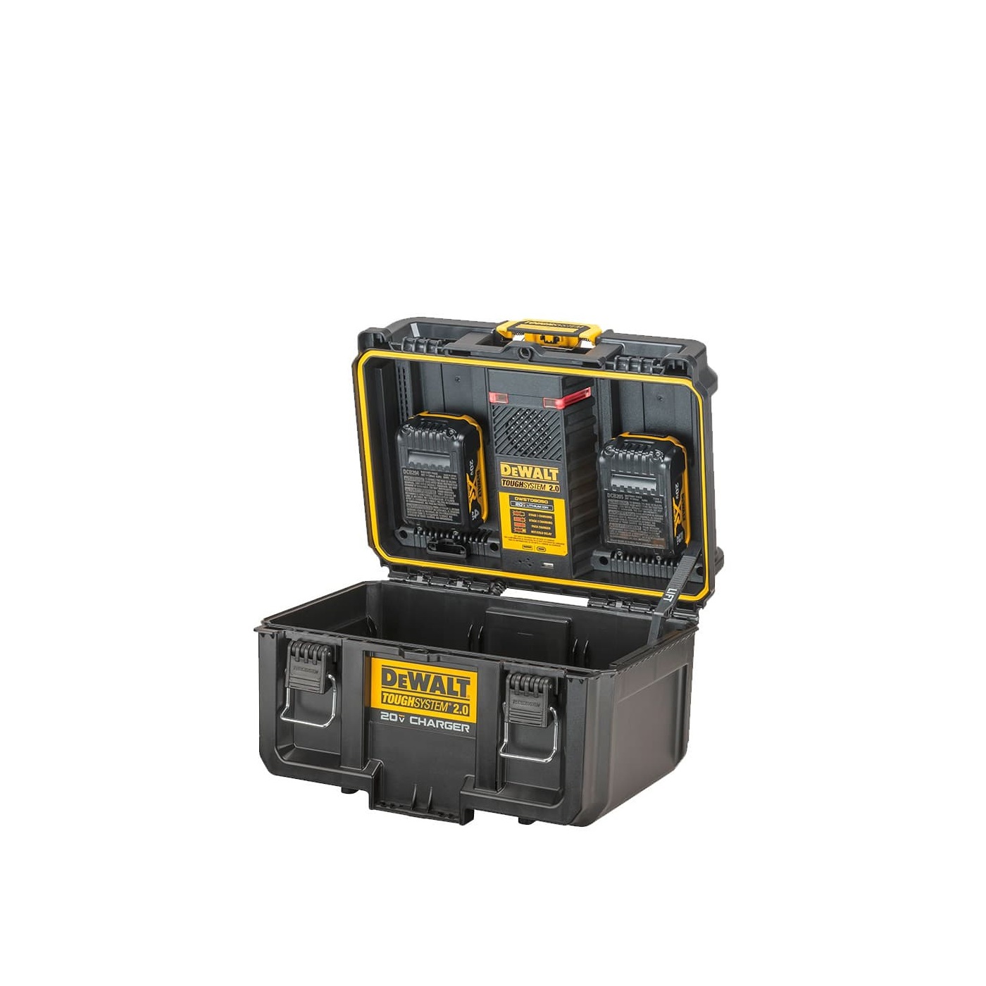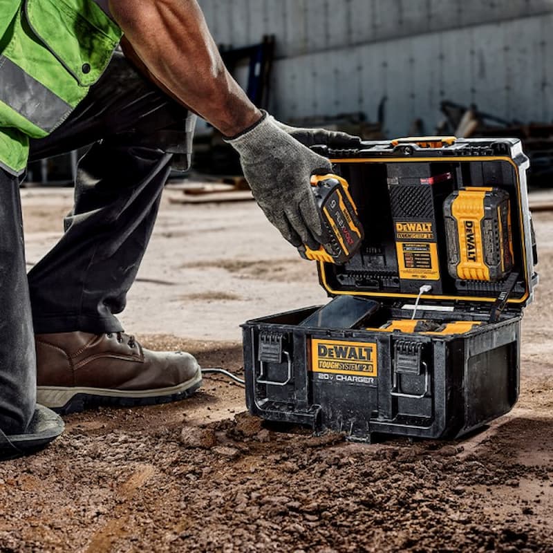 Caja de almacenaje con carga simultanea para 2 baterías DEWALT 20V MAX o DEWALT 20V/60V MAX FLEXVOLT al mismo tiempo en una caja duradera y resistente a la intemperie.