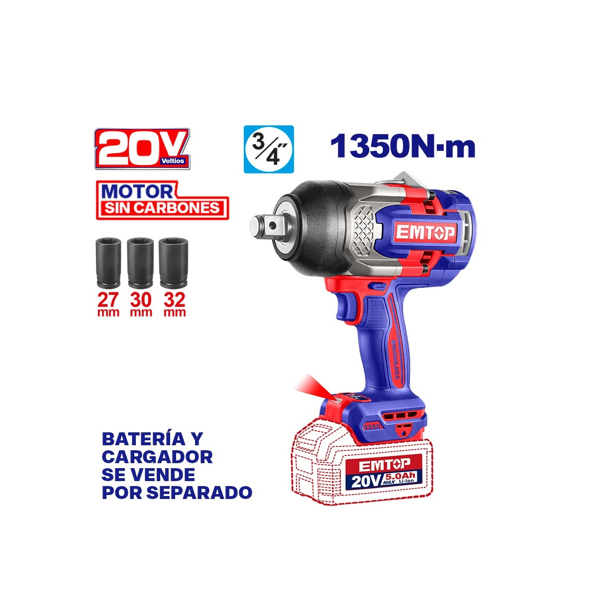 ECIWL201351 – LLAVE DE IMPACTO INALAMBRICA 3/4, 20V, BRUSHLESS, 1350NM, INCLUYE 3 COPAS MM, SIN BATERIA NI CARGADOR, BARE TOOL.