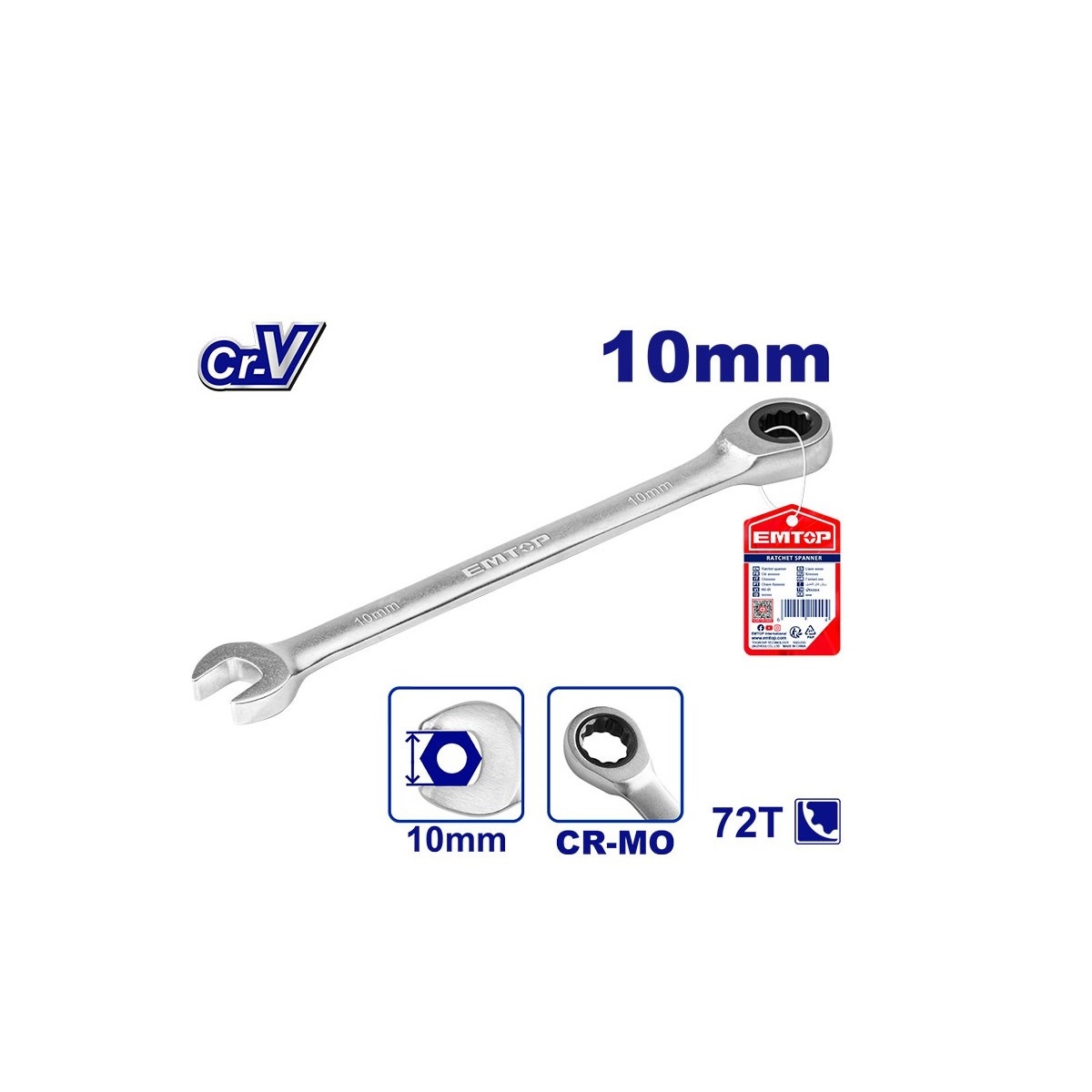 ECSPAR101 – LLAVE DE COLA CON RATCH DE 10 MILIMETROS, 12 PUNTOS, CROMO VANADIO. MARCA EMTOP