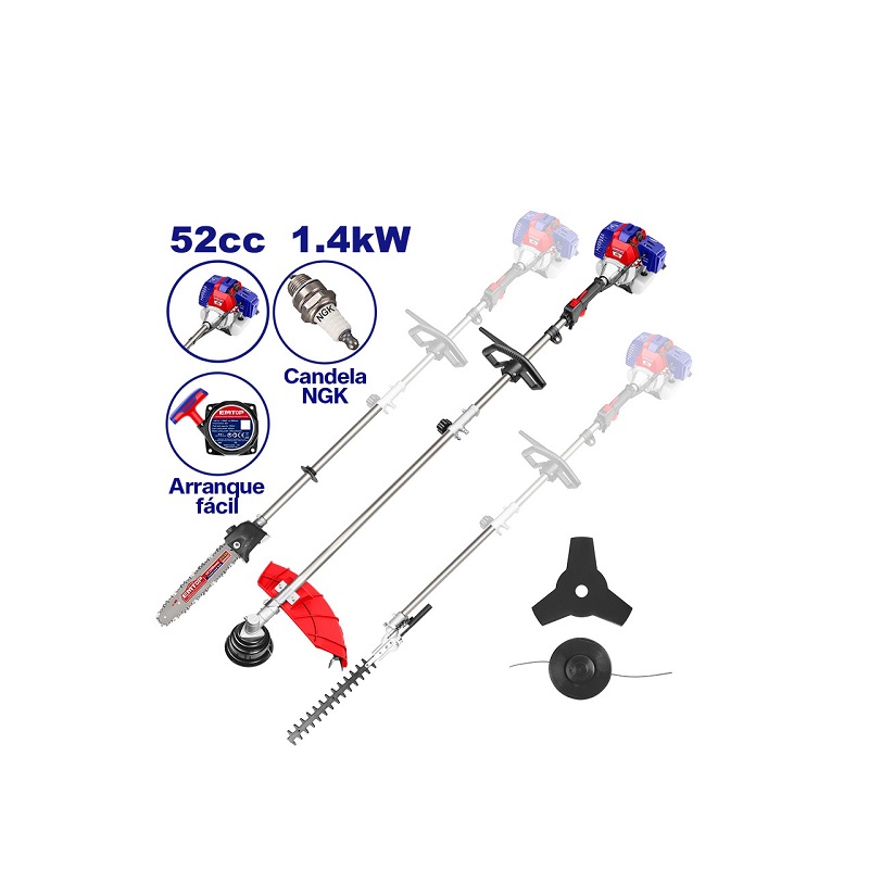 EGTC55211 – MULTIHERRAMIENTA A GASOLINA 4 EN 1, DESBROZADORA, MOTOSIERRA, CORTA SETOS, CORTA GRAMA. 52CC. 1.4KW. 10,000 RPM. EMTOP