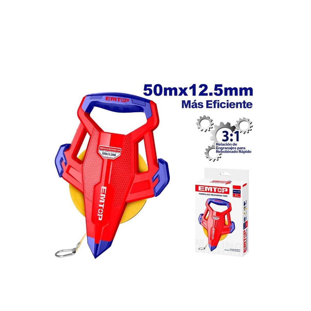 EMTP85001 – CINTA METRICA FIBRA DE VIDRIO DE 50 MTS DE LARGO, 12.5MM DE ANCHO, MANGO ERGONOMICO. MARCA EMTOP