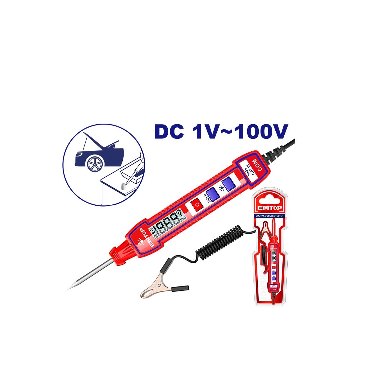 El Probador de Circuito Automotriz EMTOP es una herramienta digital precisa, diseñada para diagnosticar sistemas eléctricos en vehículos. Cuenta con una pantalla digital de fácil lectura y linterna integrada, lo que permite trabajar cómodamente incluso en zonas con poca iluminación. Es capaz de medir voltaje DC desde 0.8 hasta 100V, resistencia hasta 20MΩ, y ofrece función de prueba de continuidad con aviso sonoro.
