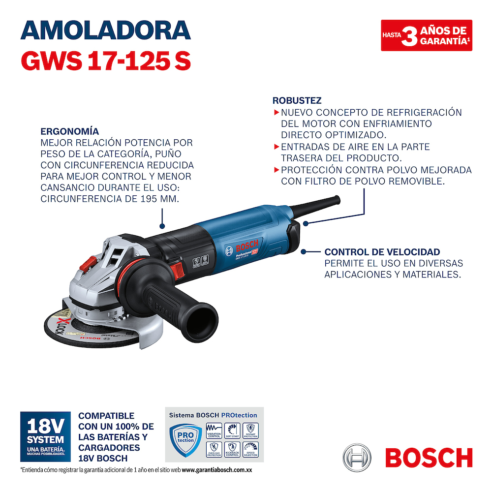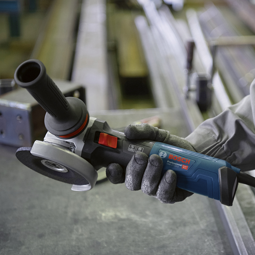 La GWS 17-125 S ofrece potencia elevada, capacidad de sobrecarga y protección mejorada contra el polvo mediante entradas de aire en la parte trasera de la herramienta con filtros de polvo extraíbles, características que aseguran una productividad máxima. Gracias a su superficie de agarre significativamente pequeña, esta amoladora equipada con un potente motor de 1700 W ofrece más comodidad al trabajar en la industria del metal. Incluye KickBack Control, Restart Protection y una empuñadura lateral Vibration Control, que ofrecen una mayor protección del operador.
