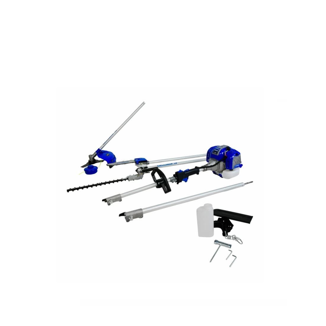 Incluye: 1 cuchilla corta setos, 1 cuchilla 3 picos, 1 cabezal para hilo, 1 sierra de cadena y ¡1 EXTENSIÓN ADICIONAL DE 75 CENTÍMETROS!.