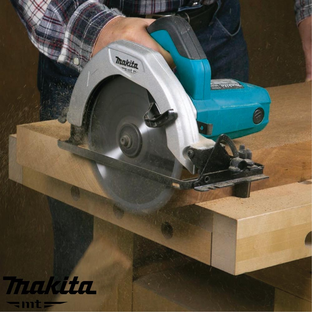 Sierra Circular Makita diseñada para realizar cortes rectos y cortes a inglete longitudinal y transversalmente en madera mientras mantiene un firme contacto con la pieza de trabajo.