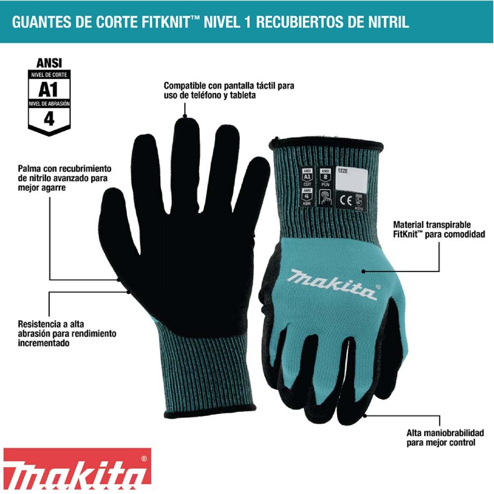 Guante anti corte FitKnit Nivel 1 – L/XL, Marca: Makita, Unidad de medida: Unidad, Código SKU: 1753209, Modelo: T-04123