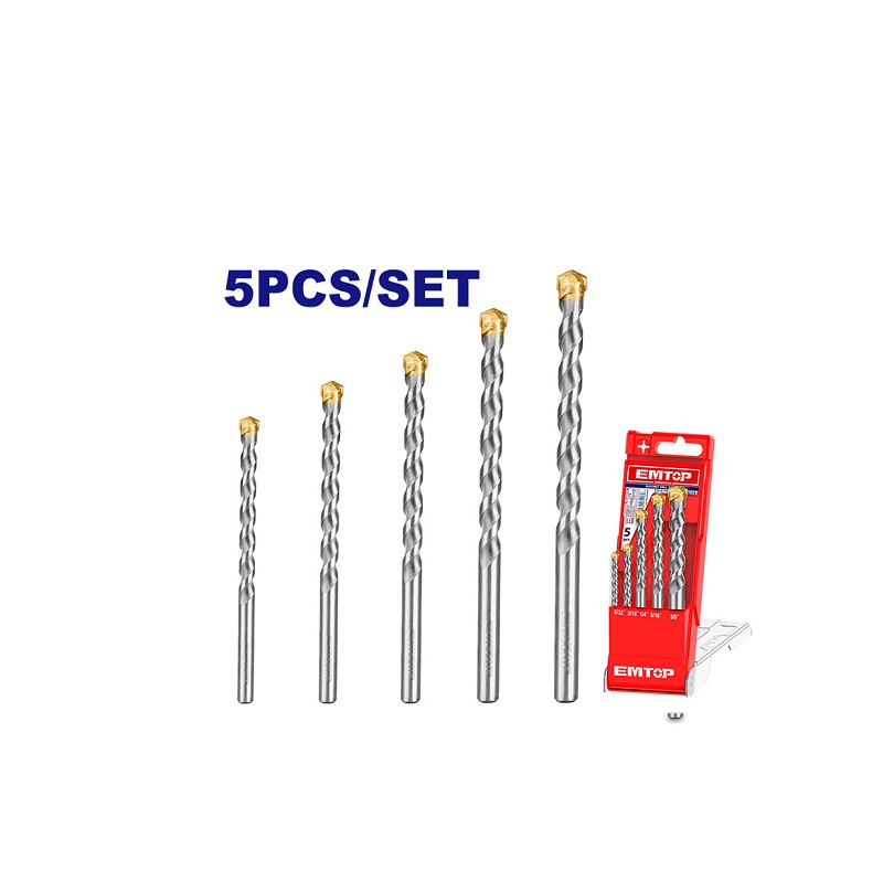 - El juego de brocas EMTOP está diseñado para perforar concreto, ladrillo y mampostería de manera eficiente y duradera.