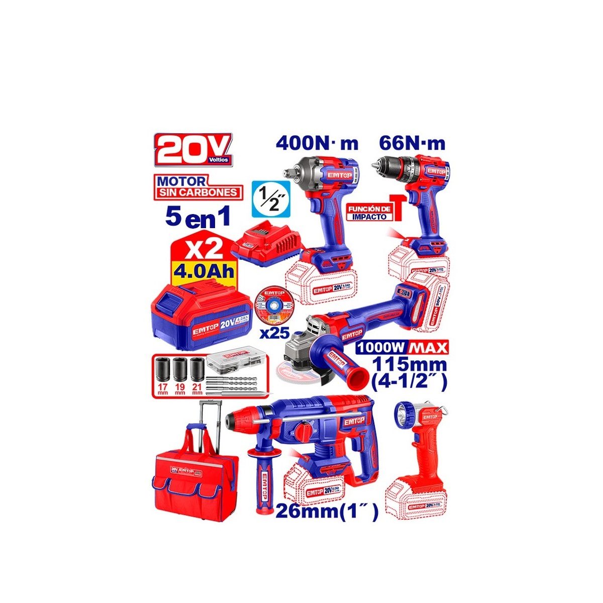 Incluye esmeriladora, taladro percutor, rotomartillo SDS Plus, llave de impacto y lámpara de trabajo