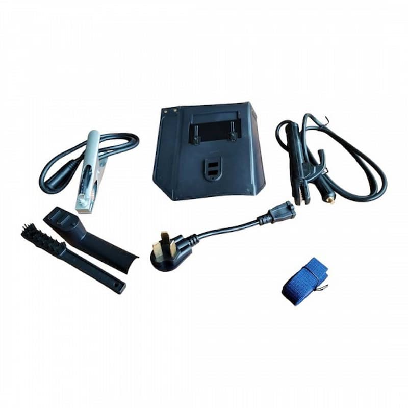 Incluye: 1 porta electrodos con cable, 1 abrazadera a tierra con cable, 1 cepillo de alambre, 1 careta para soldar, 1 correa.
